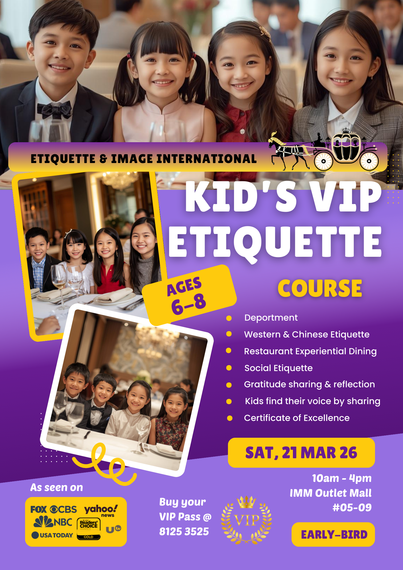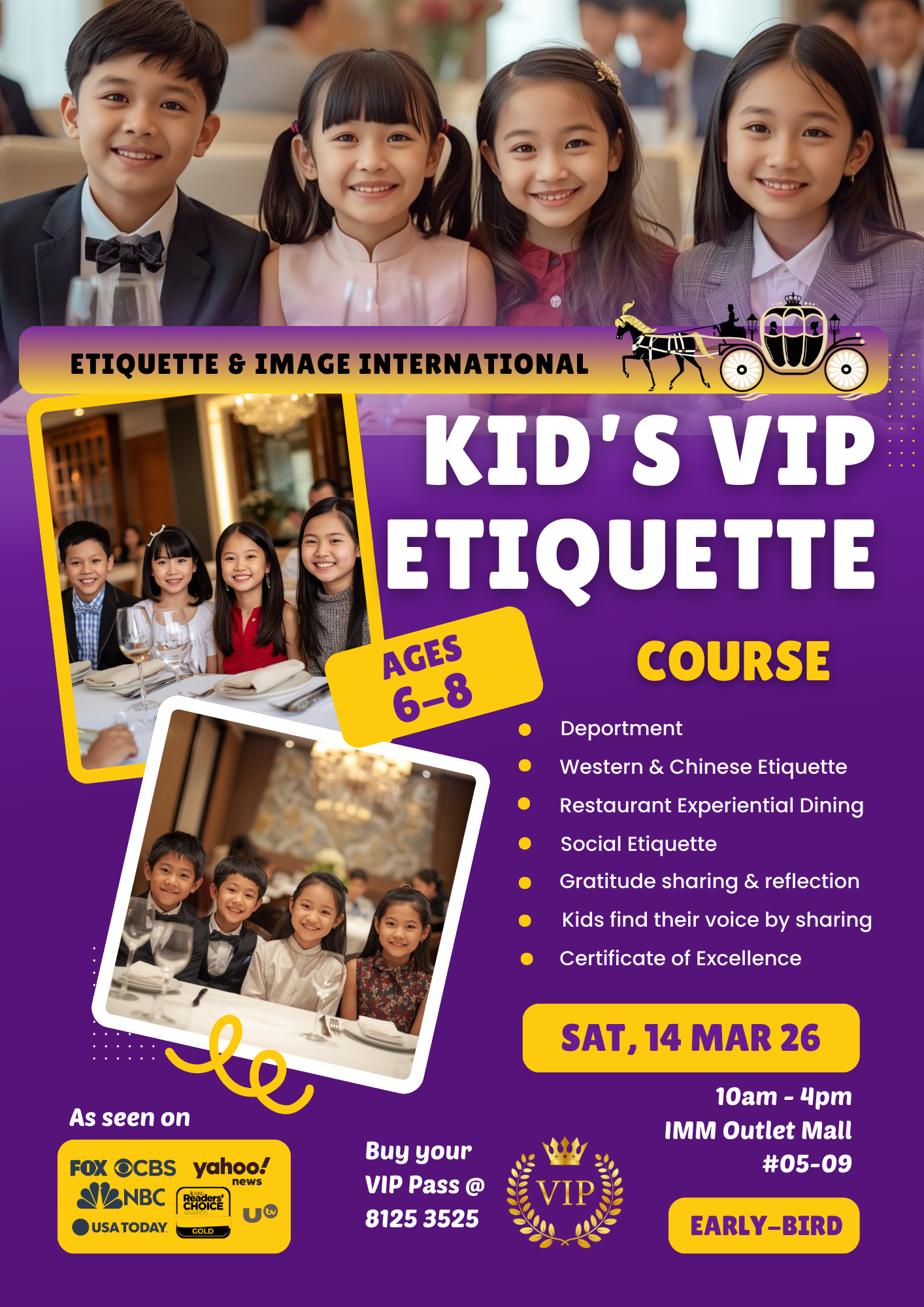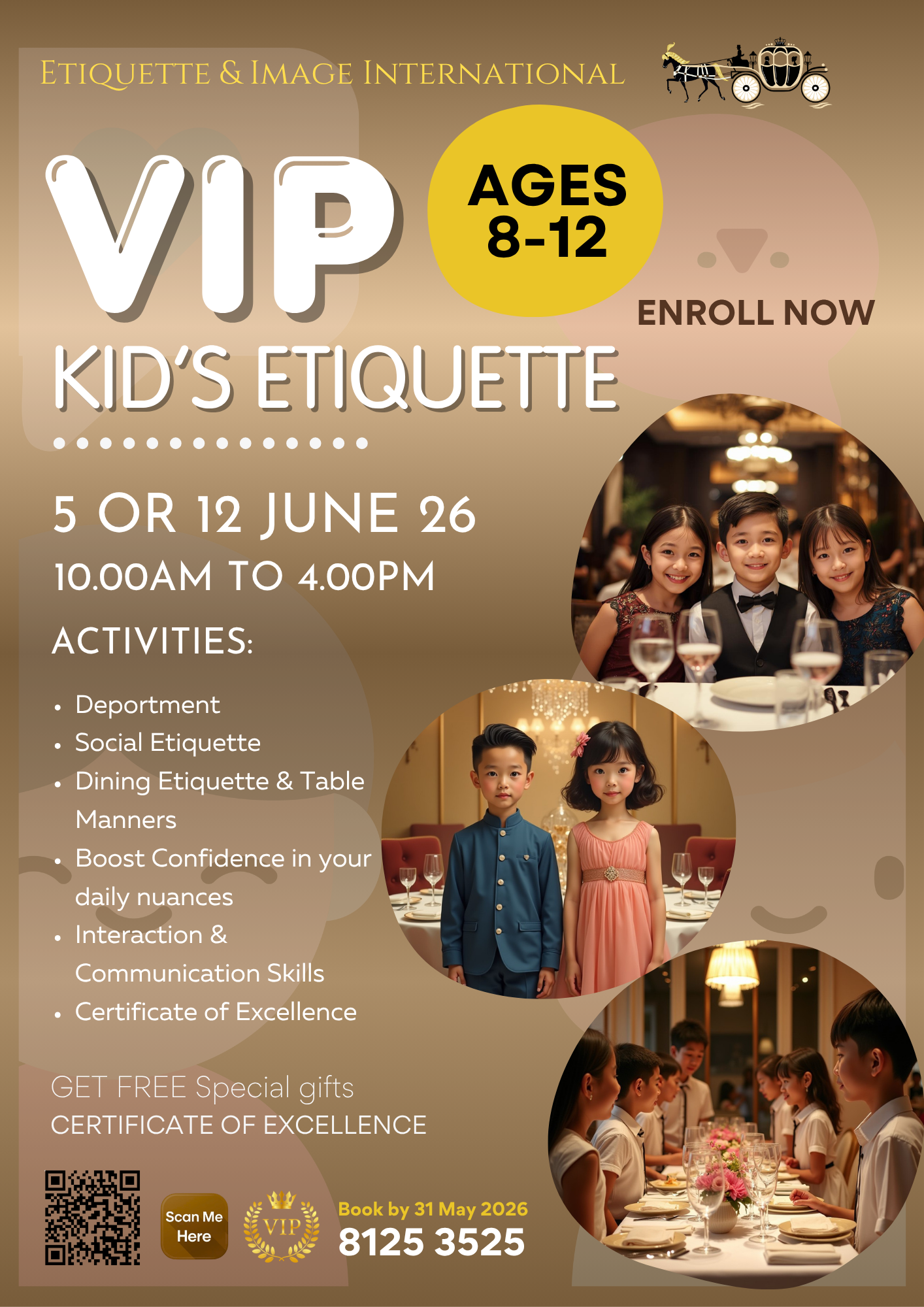 Give your child a confident, polished, and joyful social foundation through our VIP Children Mannerism Workshop, specially designed for children aged 6–8 years. This immersive, hands-on experience introduces young learners to modern social etiquette, table manners, and cross-cultural awareness in a fun, supportive, and elegant environment. Perfect for children who are beginning to attend social events, family gatherings, and formal dining settings.